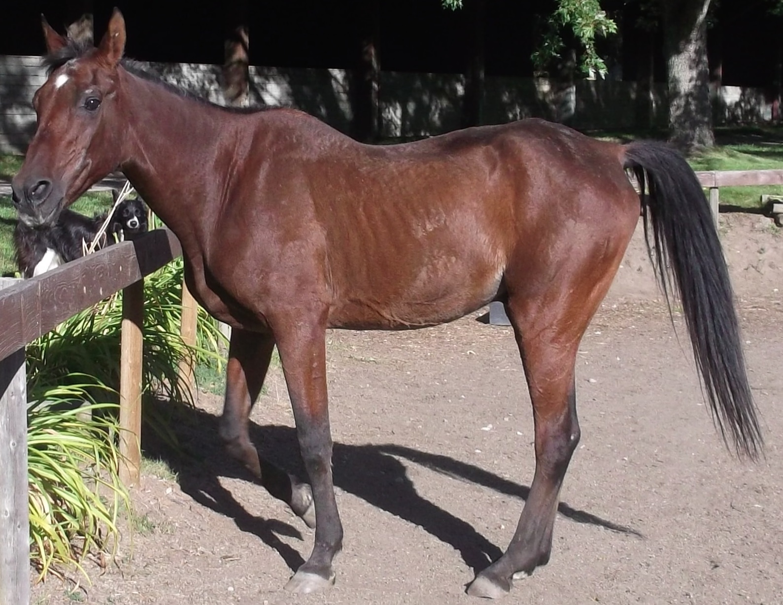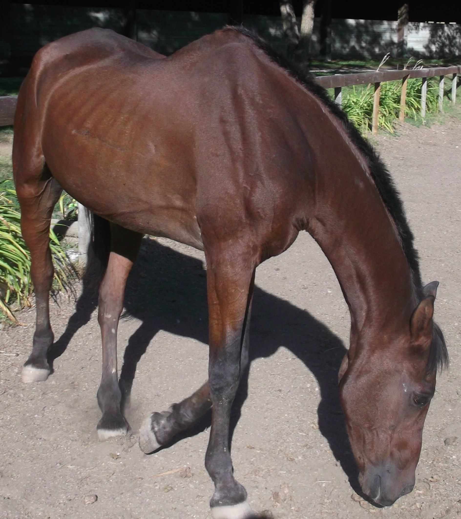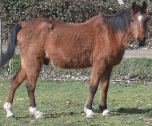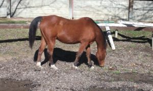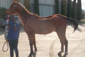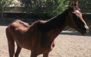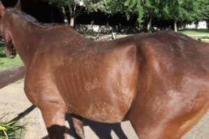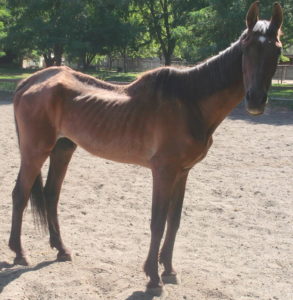 At rescue Johnny and  RC each scored dangerously low on the body scoring scale used by law enforcement to judge emaciation in livestock. Head held high, nostrils flared, and showing the whites of his eyes, RC exhibited a pitiable awareness of his own vulnerability. Johnny, on the other hand, was stoically indifferent, even though every bone in his body was visible under a thin layer of skin. Luckily, both horses had been referred to Equamore in time to prevent the fate of so many other neglected and starving horses.  Following an all-too-familiar protocol, our helpers fed them a special, twice-daily diet of high fat rice bran, alfalfa pellets, and senior horse feed mixed with water to soften, as well as all the hay and/or alfalfa they could eat. Careful monitoring of their diet continued until they began to recover the lean skeletal muscles their bodies had been forced to consume to stay alive.