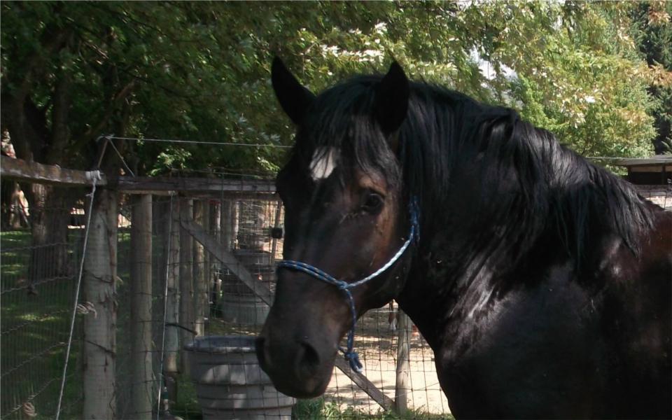 It is suspected that Gandalf was born in that field and spent a good part of his young life defending himself from the other two dominant stallions. In 2012 the owner agreed to surrender his untrained and unmanageable herd. Finally, in 2013, Gandalf, Flint (also a stallion), and the mare Diamond were transported to the Equamore Sanctuary. Gandalf, then age seven, was gelded and his most recent (and rather severe) wounds treated. He healed beautifully and responded well to his training, adapting comfortably to his new environment.