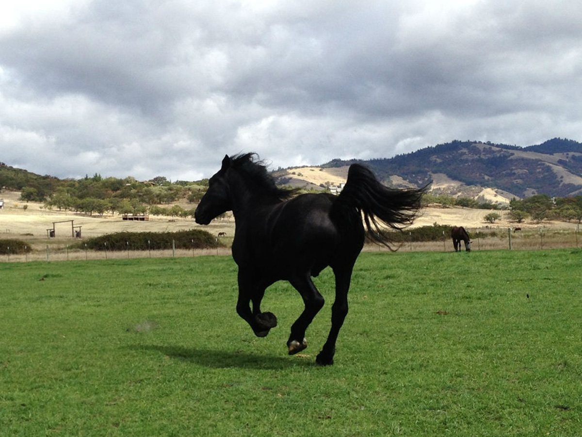 Gandalf’s life before Equamore is a fairy tale gone wrong. Named after the powerful wizard in “The Lord of the Rings,” the young stallion had been the innocent victim of an owner who dreamed of a tranquil herd of Percheron stallions and mares living freely on a large property in northern California. Unfortunately, Gandalf’s battle-scarred body bore witness to the folly of allowing multiple stallions to breed indiscriminately with mares while all inhabited the same field.