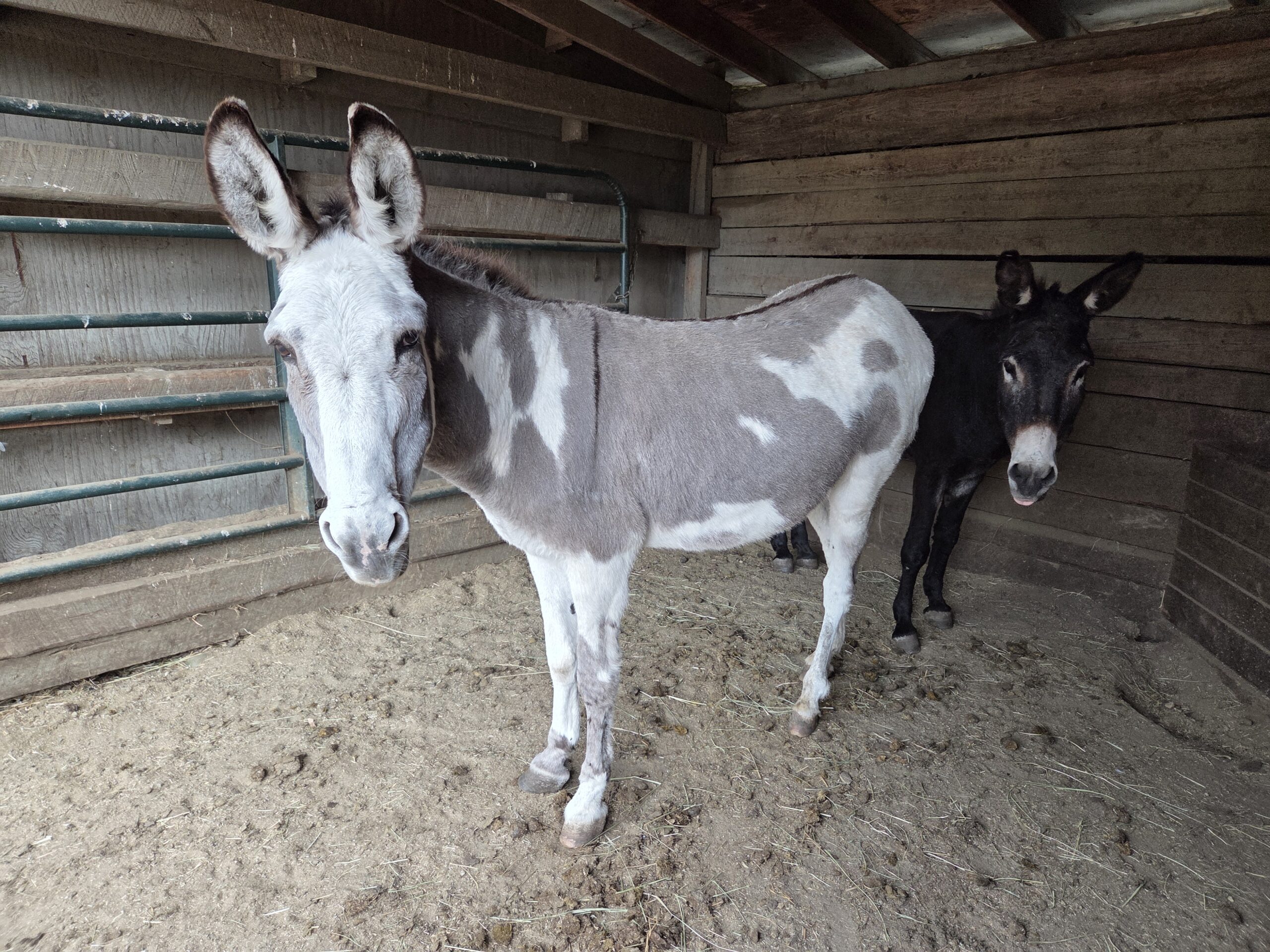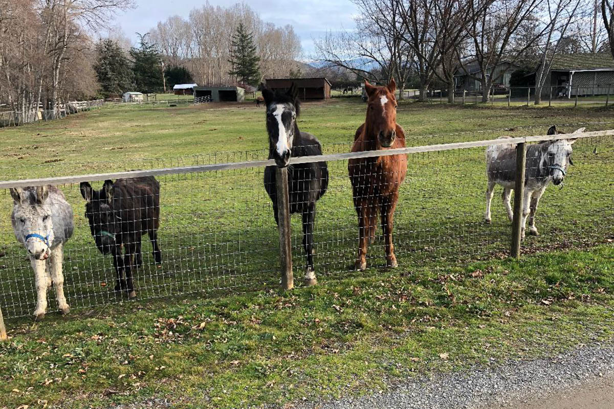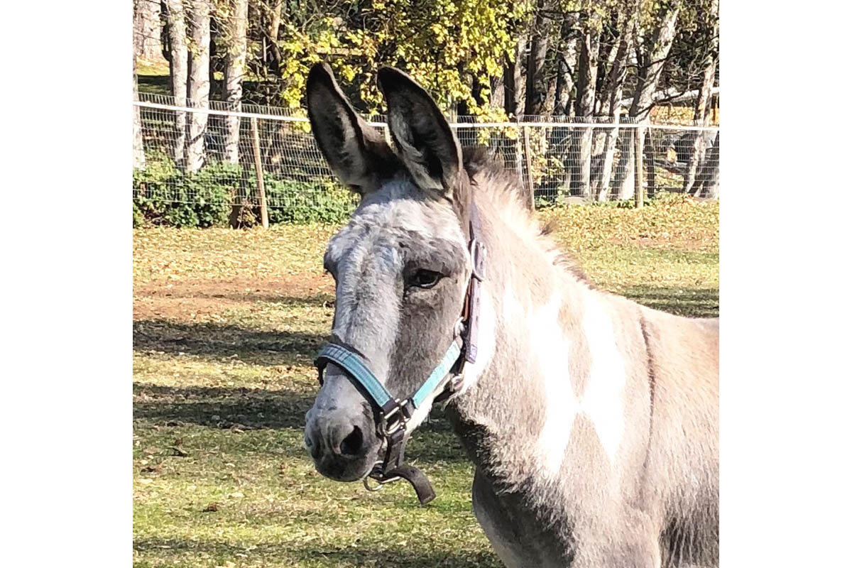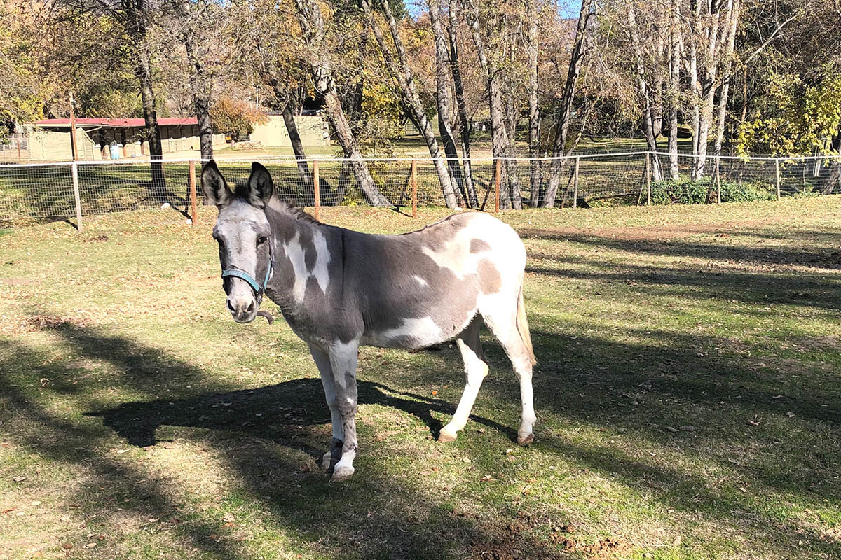Holly is an adorable spotted Jenny who came to us from the Klamath County Animal Shelter. She had been kept in a pasture with three other donkeys about ten miles outside the town of Bly, Oregon. The pasture was well hidden from view off a long dirt road. She and the other donkeys got out of their enclosure one day and were seen by a passing motorist. The motorist stopped and took a picture of Holly’s overgrown feet and submitted it to Klamath Animal Control. At the same time Holly was reported, another report was made about a mini mule in the town of Bly known as Happy (owned by the same person) who also had overgrown hooves.