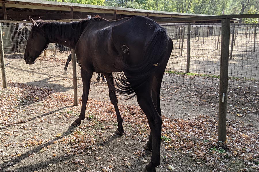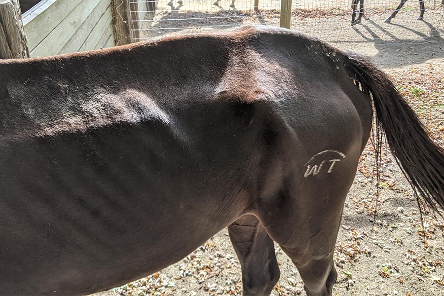Purchased off the racetrack, Johnny Boy was turned out into a field and denied food and hoof care for an estimated three months. His coat clung to what was left of his scant musculature and gaunt frame. He was so underweight that his withers, the highest point of a horse’s skeletal structure, sunk below the height of his hips. His front feet were shod in mismatched shoes, and his hind hooves had abscessed and were so rotted out with thrush that the hoof trimmer had to peel off layers of necrotic and diseased tissue before the healing process could begin.