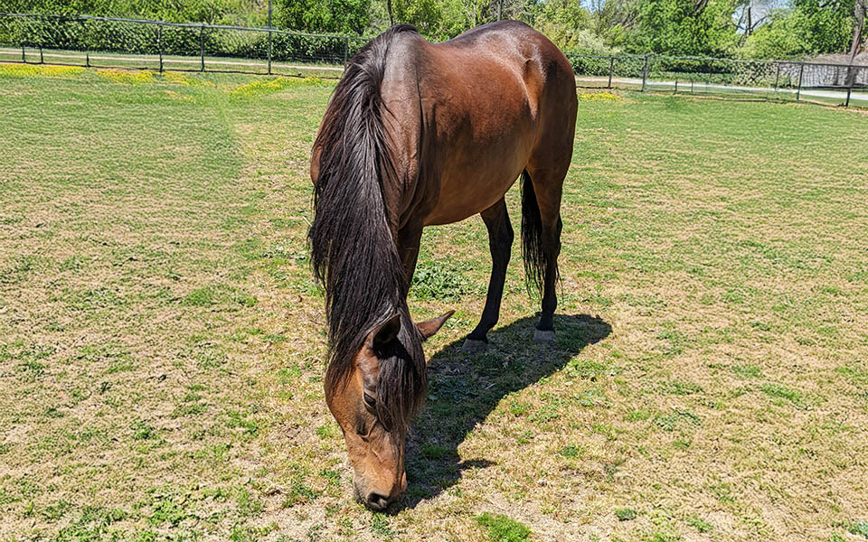 For the first nine months after her arrival, she occupied the field and shelters next to the main barn with the three mares and one gelding she was rescued with. In October of 2023 she moved into the main barn where she has her very own stall. She eagerly comes in from her daily turnout to her stall which she clearly enjoys. She allows her front feet to be regularly trimmed, but handling her hind feet is still a work in progress.